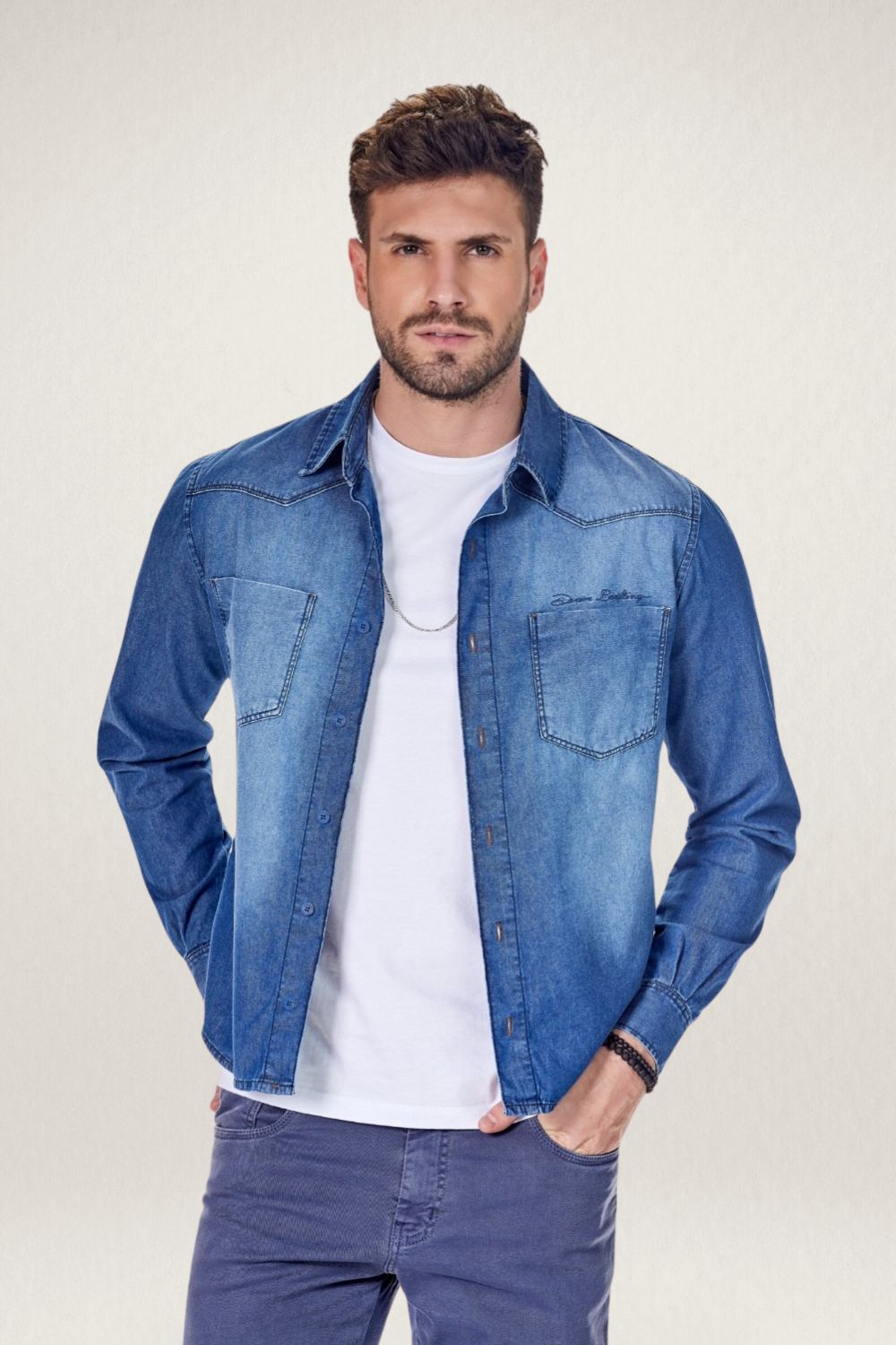 | A Camisa Jeans Pedro em sarja denim blue. Possui modelagem com caimento slim. A camisa é composta por gola, fechamento frontal por botões, bolsos frontais com bordado, mangas longas com abotoamento simples. Lavagem super stone com pontos de luz localizados. |